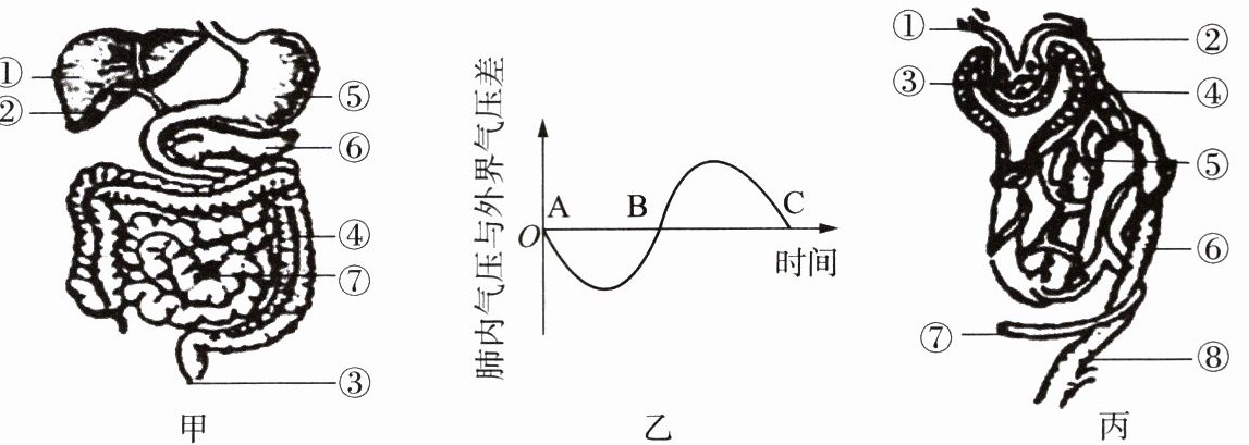 26. (10 分)跑步是人们非常喜爱的一种锻炼方式,也是中学“阳光大课间”运动项目之一。它不仅可以提高人体心肺功能,增强免疫力,还可以愉悦身心。图甲是消化系统的部分结构示意图,图乙是平静呼吸时肺内气压变化曲线,图丙是肾单位结构示意图。请据图回答下列问题。