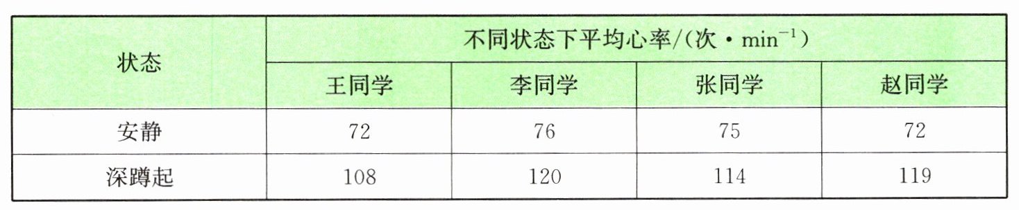 (3)为探究深蹲起运动对心率的影响,四位同学在每完成 30 次深蹲起后及时测量自己的心率,重复进行三次,结果如下表所示。