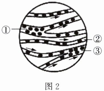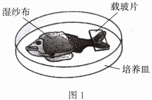 小张同学进行了“观察小鱼尾鳍内的血液流动现象”的实验,图1表示对实验材料的处理,图2为显微镜下观察到的视野(箭头表示血流方向)。请据图回答6~13题。