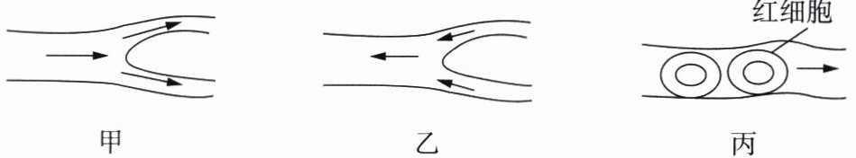 9. 小张在观察了小鱼尾鳍血液流动情况后,绘制出甲、乙、丙三幅图分别代表小鱼的三种血管,箭头代表血液流动方向。下列关于这三种血管的描述,正确的是(