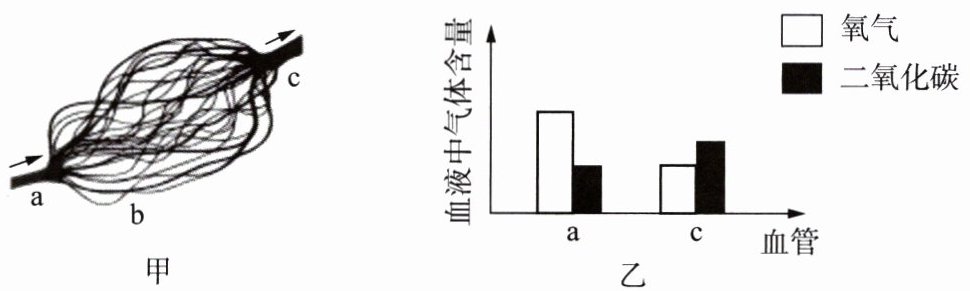 12. 图甲是人体内三种血管的关系示意图,其中箭头表示血液流动方向;乙图表示a、c血管血液中的气体含量。下列叙述正确的是(