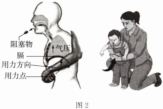 14. 据统计,春节期间,儿童气管、食管异物风险增加,患儿总量比平日增加 15%~20%。在紧急情况下,可采取图 2 所示的海姆立克急救法实施救助。请据图回答下列问题。