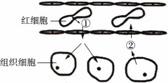 9. 右下图为血液与组织细胞之间气体交换的示意图。图中①②是两种不同的气体,据图分析,下列叙述错误的是(