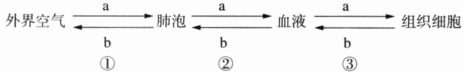 13. 人体细胞获得氧气,排出二氧化碳,必须经过下图中①②③等过程来完成,下图中 a、b 表示气体。下列相关说法错误的是(