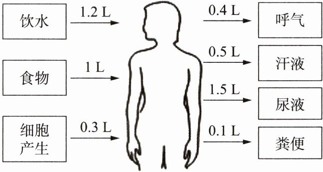 14. 水约占成年人体重的60%,在体内参与物质运输和各项生命活动等。下图是某健康成年人24h内水的来源和去路示意图,请据图回答下列问题。