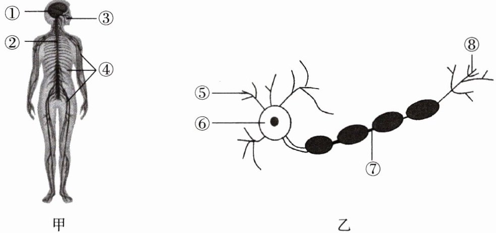 篮球场上,少年们运球、传球、投篮,动作精准,配合默契,这一系列的动作都是在神经系统的调节下完成的。图甲是神经系统的构成示意图,图乙是神经元模式图。请据图回答 1~7 题。