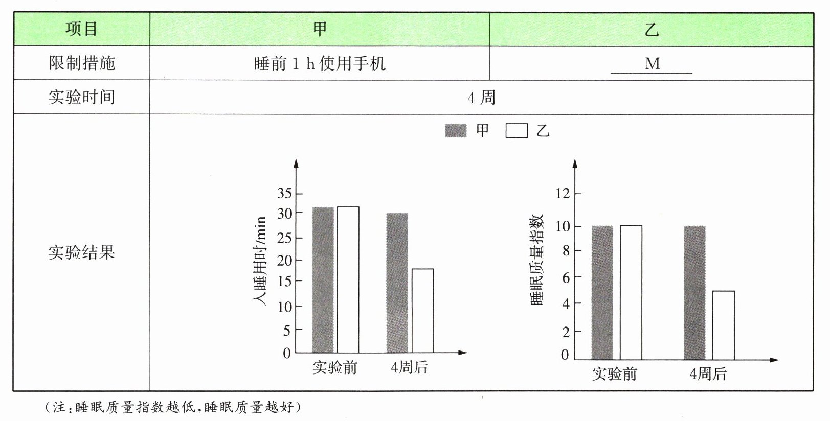 随着智能手机的普及,很多人选择在睡前长时间使用手机玩游戏、刷视频等,睡前玩手机的习惯对睡眠是否有影响呢?科研人员在某大学选取了 400 名有睡前玩手机习惯的健康大学生,分成甲、乙两组并进行了相关实验,实验过程和结果如下页表所示,请分析并回答下列问题。