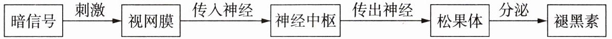 (4)研究发现,褪黑素是松果体(位于脑)分泌的一种促进睡眠的激素。在医生指导下,口服一定剂量的褪黑素可改善睡眠。褪黑素的分泌具有明显的昼夜节律,白天(光信号)分泌受抑制,晚上(暗信号)分泌活跃。下图表示暗信号条件下,人体褪黑素分泌的调节过程。