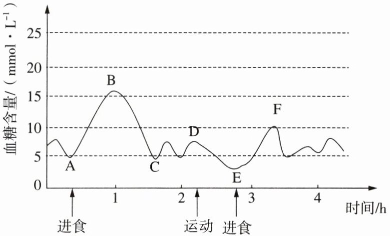 (5)图中 DE 段由于运动消耗,促进血糖______,在“鸡蛋、花生、西瓜汁、牛肉干”这四种食物中能最快将血糖调整到合理范围内的是______。