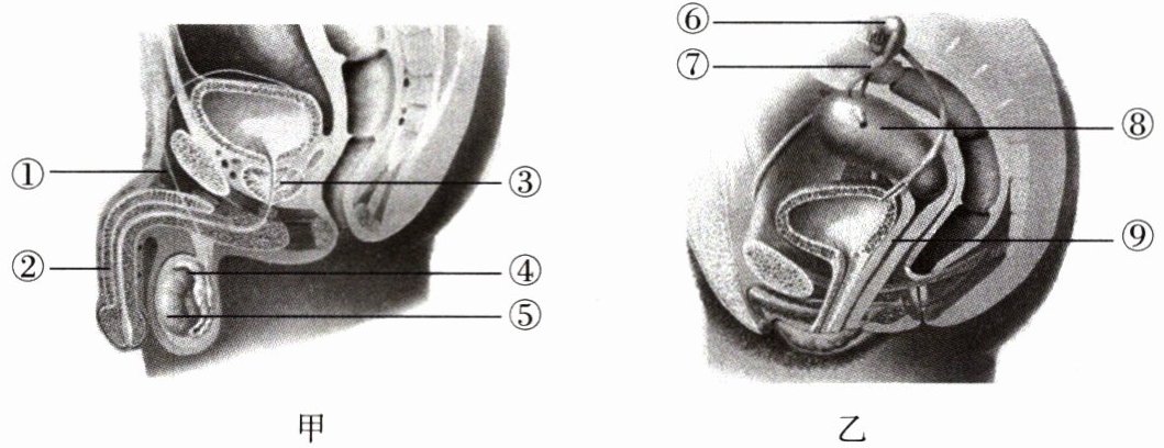 人类的生殖和发育是人类繁衍的必要过程。图甲表示男性的生殖系统,图乙表示女性的生殖系统。请根据所学知识回答1~2题。