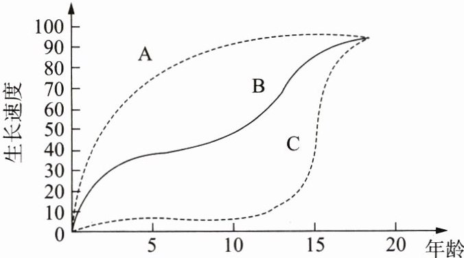 青春期是青少年身体和心理迅速发育直至成熟的一段时期,此时青少年的脑部结构和功能趋于完善,生殖器官开始迅速发育。下图中,曲线A、B、C分别代表人全身及不同器官的发育曲线图。请据图分析并回答3~8题。