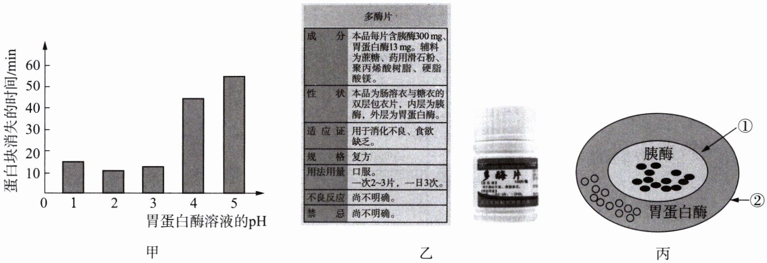 (4)多酶片常用于治疗消化不良,图乙为肠溶衣和糖衣的双层包衣片,包裹着胃蛋白酶和胰酶(胰酶在酸性条件下会失活),两种酶的主要成分都是蛋白质。下列关于多酶片功能及用法的描述正确的是(