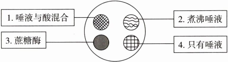 6. 在一块含有淀粉的琼脂块的四个圆点位置,分别用不同的方法处理(如下页图所示)。将上述实验装置放入37℃恒温箱中,保温处理24h后,将碘液滴在琼脂块上,其中呈蓝色的斑块是( )