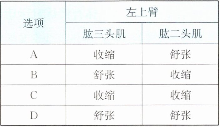 7. 左下图是某人游泳时的姿势,右下方的表格中正确描述此人左上臂肌肉状态的是(