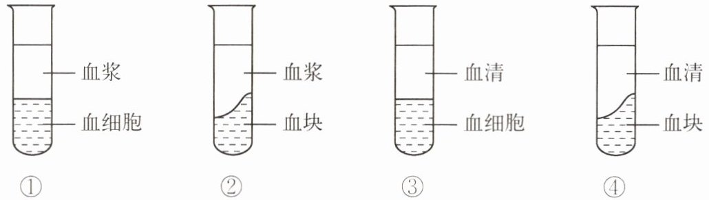 1. 小刚同学在探究血液的成分时,将等量的新鲜鸡血分别加入①~④四支试管内,然后在①、④两支试管内加入了抗凝剂,对②、③两支试管不做任何处理,静置较长一段时间。下图中表示的实验结果中正确的是(