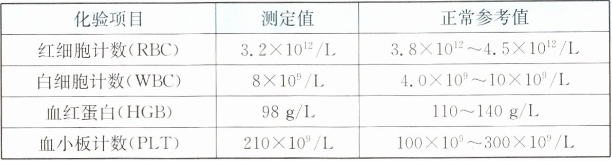 18. 血液是反映人体健康状况的晴雨表。李女士近日感到头晕、乏力。她到医院进行了血常规检查,下表所示的是她的部分化验结果。请分析并回答问题。
