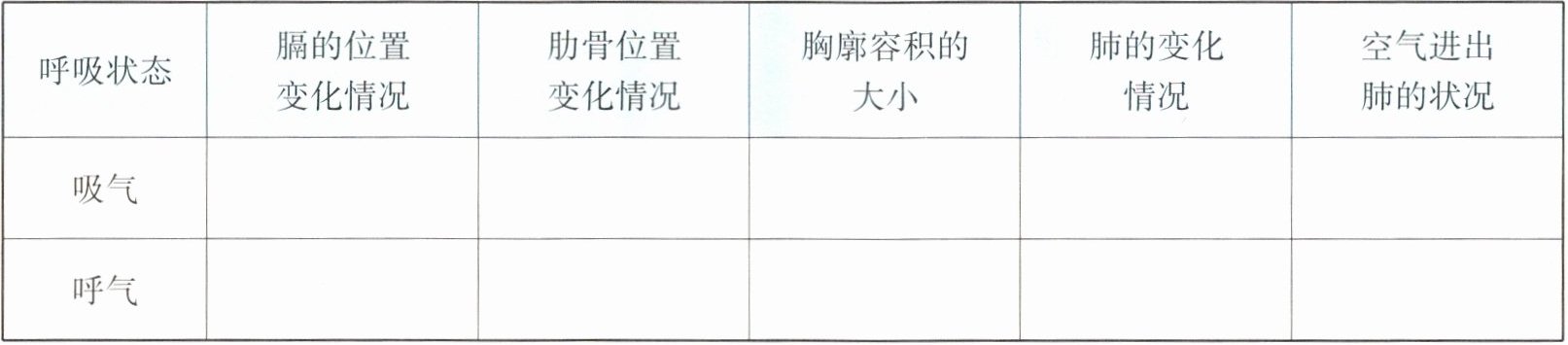2. 气体交换包括吸气和呼气两个过程。通过自制呼吸运动模型模拟呼吸运动或观察人体呼吸运动示意图,分析吸气和呼气过程,请完成下表。