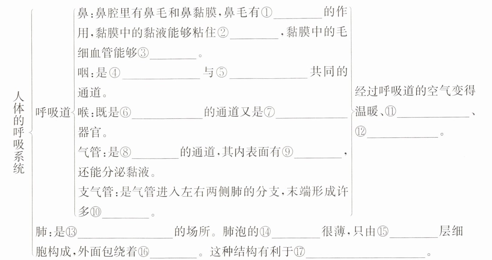 答案:1. 鼻 咽 喉 气管 支气管 肺 2. 滤去灰尘 灰尘和细菌 温暖空气 气体 食物 气体 发声 气体 纤毛 肺泡 湿润 清洁 气体交换 壁 一 毛细血管 气体交换;1. 胸廓 肺 气管和支气管 膈 2. 呼吸状态 膈的位置变化情况 肋骨位置变化情况 胸廓容积的大小 肺的变化情况 空气进出肺的状况 吸气 下降 上升 变大 扩张 由外界进入 呼气 上升 下降 变小 收缩 由内部呼出 3. 呼吸肌的收缩与舒张引起胸廓变化,引发肺内气压与外界大气压之间产生气压差,外界气体进入和排出肺。