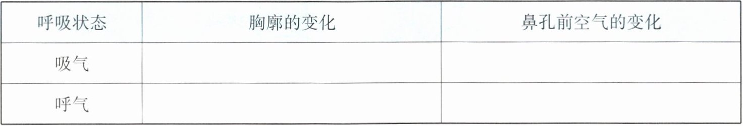 活动一:把一只手轻轻地放在胸部下侧,另一只手放在鼻腔前,缓慢地吸气和呼气。胸廓有什么变化?鼻孔前面的空气有什么变化?请完成下表。