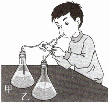 1. 如右图所示,小明在吸入气体时,左手捏紧橡皮管,右手松开;在呼出气体时,右手捏紧橡皮管,左手松开。甲、乙两个瓶中都装有澄清的石灰水。请据图回答问题。