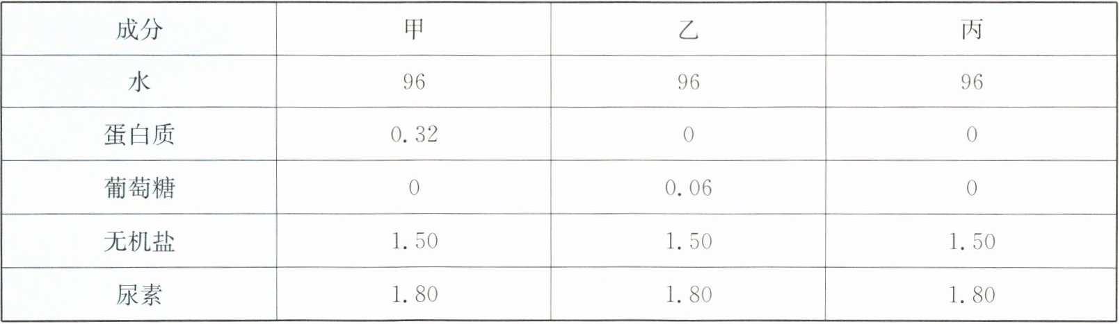 某医院化验室对甲、乙、丙三人的尿液进行分析,所得数据如下表所示。请据表回答问题。