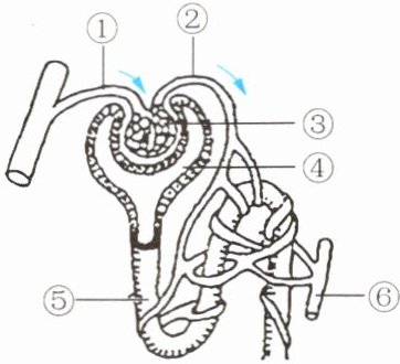 答案:(1)入球小动脉 出球小动脉 (2)肾小体 (3)血液 原尿 (4)肾小球与肾小囊的滤过 肾小管的重吸收 (5)肾小管