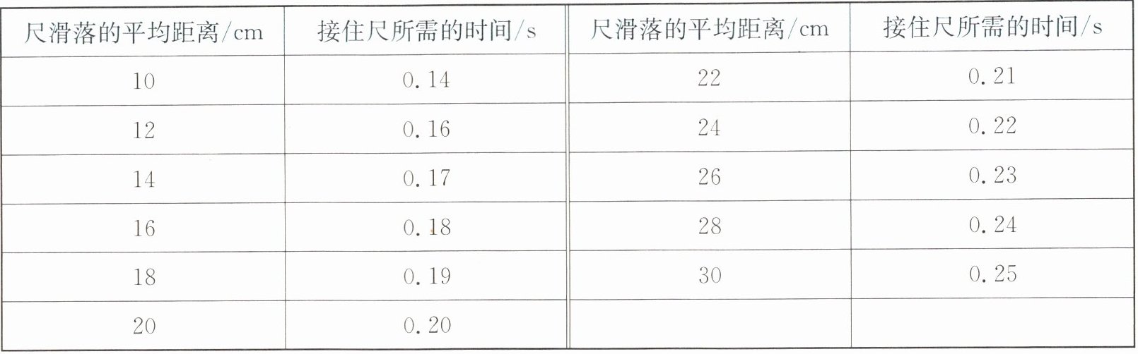 下表是根据计算得到的尺滑落的平均距离与反应时间(接住尺所需的时间)对照表。请你与同学配合,测定反应时间,并将你的测定结果与表中数据对照。