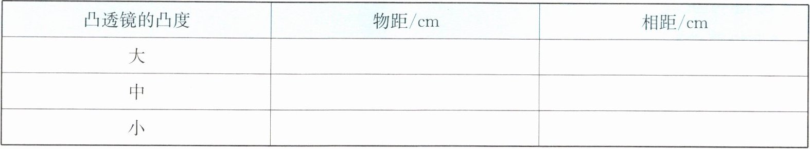 1. 将眼球成像模型分别换上三个凸度不同的凸透镜,凸透镜与白纸板的距离保持不变,左右移动蜡烛,直至白纸板上出现清晰物像,测量物距的变化数据,完成下表。