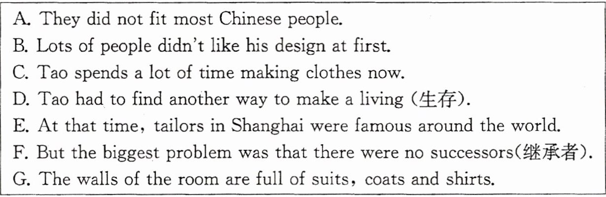 Tao got to Shanghai in 1990. He was a good tailor (裁缝) and he made clothes for teachers and students. 2.