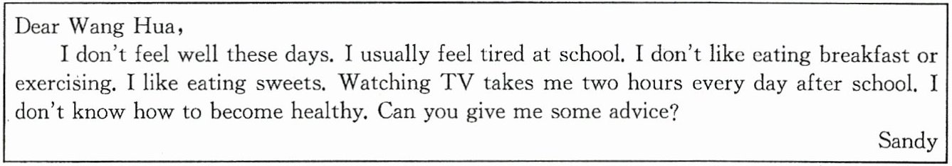 答案:Dear Sandy, I’m glad you write to me. I think you really need to change your lifestyle. Breakfast is very important. It gives you energy for a whole day. Eating too many sweets is not good for your health. You need to eat more healthy food, like vegetables and fruit. I think you should watch TV for less than half an hour a day. You can take more exercise, like taking a walk outside after dinner. You can also do some reading. I hope you can become well soon. Wang Hua