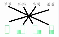 3. 在桌子上放了一个正方体和一个长方体。小明和爷爷、爸爸、妈妈站在如图所示的位置上,他们分别看到哪一幅图? 请连一连。