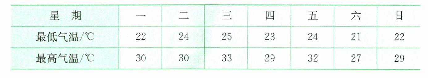 答:这一周平均每天的最低气温是23摄氏度。最高气温是30摄氏度。
