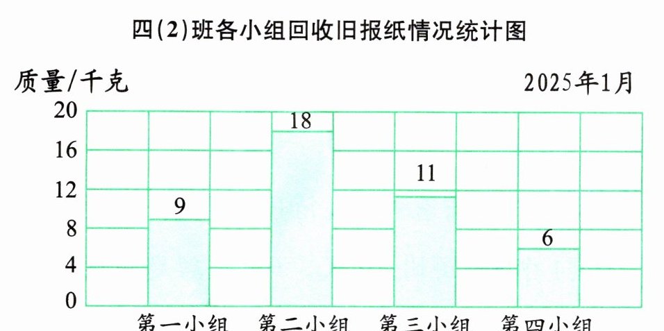 答案:(1) 这学期,第(二)小组回收旧报纸的质量最多,第(四)小组回收旧报纸的质量最少。
