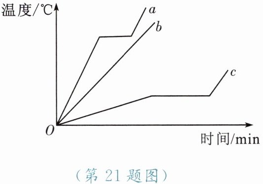 21. 如图所示,a、b、c三条图线分别表示三种质量相等的固体在同等条件下加热时的熔化图像,由图可知,