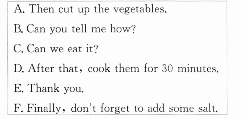 B:接下来,把牛肉、胡萝卜和土豆放进锅里,再加一些水。3. ____然后,加入卷心菜、西红柿和洋葱,再煮10分钟。