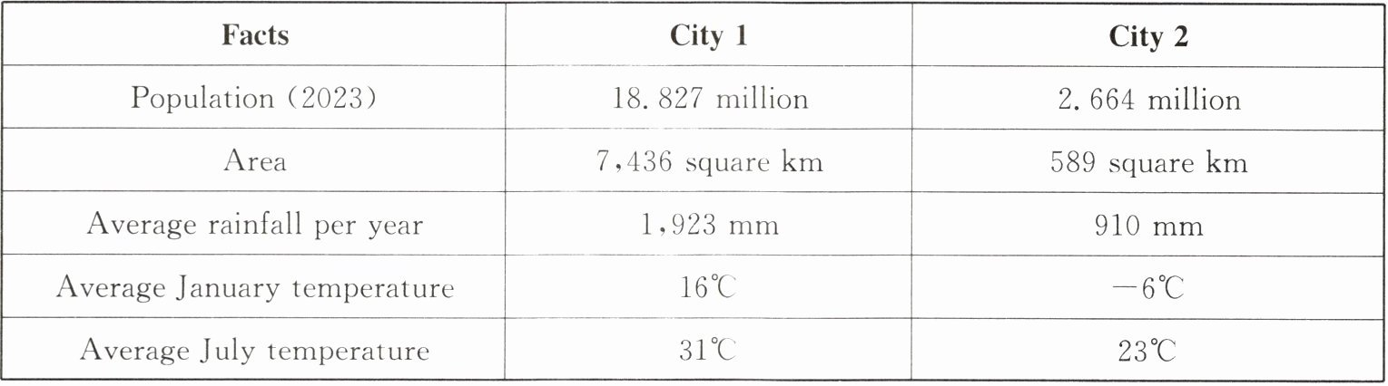 The population of City 1 was much 1. ______ than that of City 2 in 2023. In area, City 2 is 2. ______ than City 1. If you like rain, you may like City 1's weather 3. ______ than City 2's. City 2 is cold in January. It is much 4. ______ than City 1 in January. City 1 is 5. ______ than City 2 in July.