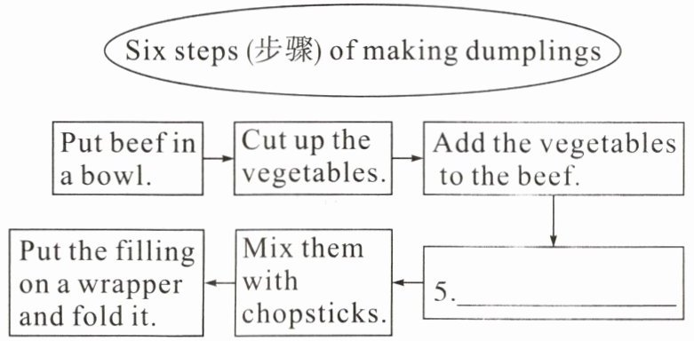How to make dumplings:Put beef in a bowl. Cut the vegetables into small pieces with a knife. Add the vegetables to the beef. Then add a little oil and salt and mix them with chopsticks. When it is ready,put a spoon of filling(馅)on a wrapper and fold the wrapper around it.