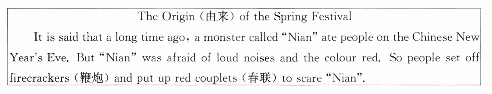 On the Spring Festival,Chinese people wish their family members and friends good health and luck for the whole year. They see the Spring Festival as a time to get together and usually celebrate it with a big family meal on the Chinese New Year's Eve(除夕).