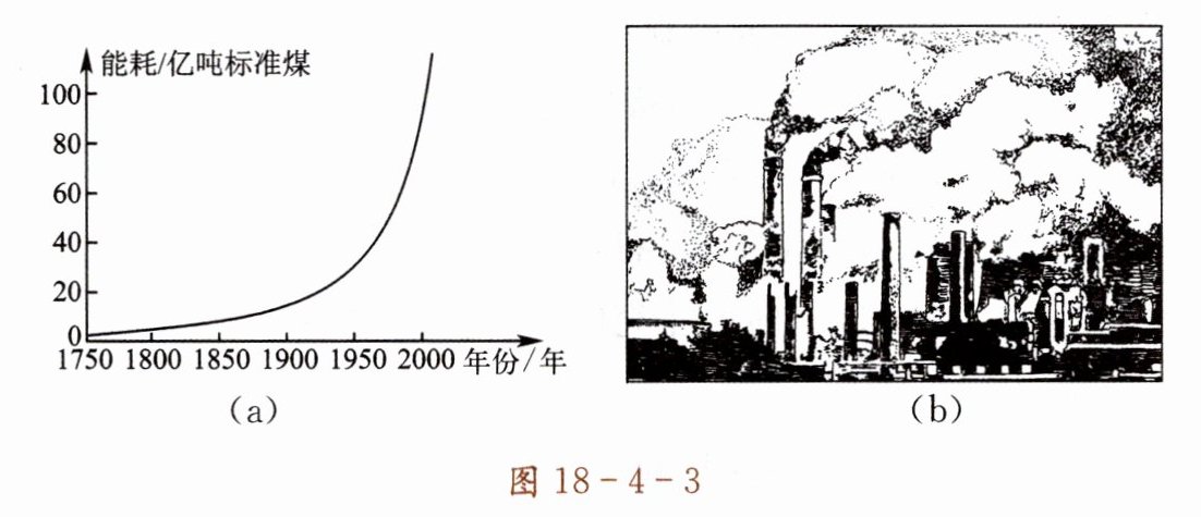 2. 能源是人类社会存在和繁荣的物质基础之一,图 18-4-3(a)为两个多世纪以来,人类能源消耗曲线图,图 18-4-3(b)为某燃煤电厂全景图。据图回答: