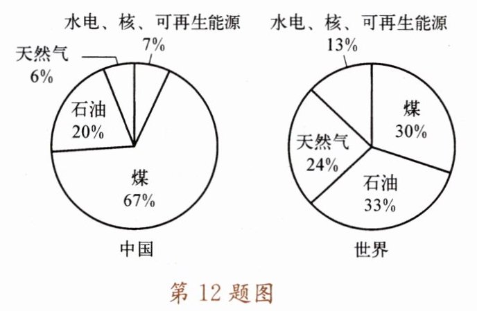 12. 与世界能源结构相比,我国目前的能源结构存在不足,如图所示。以下措施中有利于优化我国能源结构的是(