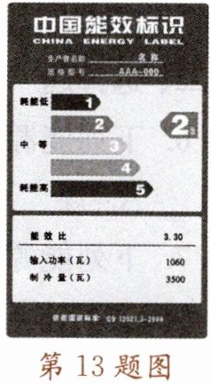 13. 我国已对家用电冰箱、空调这两个产品实施能源效率标识制度,以后生产、销售、进口的电冰箱和空调均在显著位置粘贴“中国能效标识”的标签(如图所示)。家用电冰箱、空调按能效分为1、2、3、4、5五个等级,等级1表示产品最节能,等级5是市场准入指标,低于该等级要求的产品不允许生产和销售。