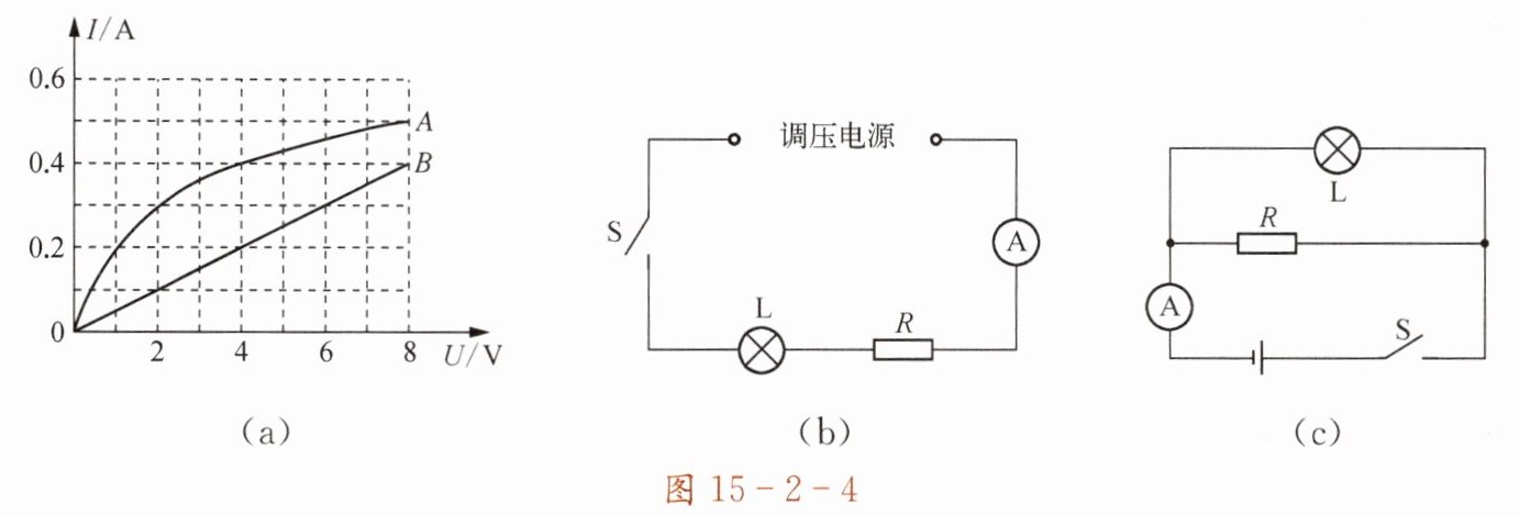 (3) 如图15 - 2 - 4(b)所示,将灯泡 L 和电阻 R 串联接到调压电源上,若通过电阻 R 的电流为0.2 A,则电源电压是多少?
