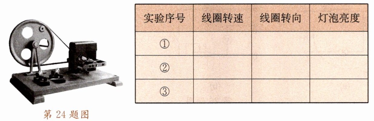 24. (6分)在学校实验室开放时,同学们对手摇发电机非常感兴趣。他们想,发电机产生的感应电流大小跟哪些因素有关呢?于是他们开展了探究,以下是他们所用的发电机(如图所示)和实验记录表。