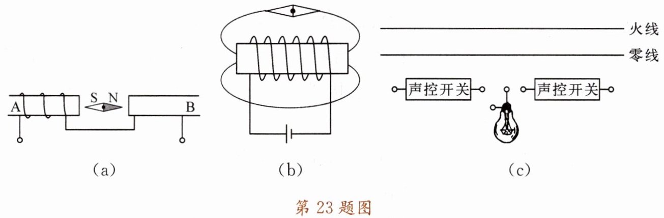 (3)声控开关在接收到一定响度的声音时会自动闭合一段时间。某地下通道两端的入口处各装有一个声控开关来控制同一盏螺纹灯泡,为确保行人不管从哪端进入,灯泡都能发光。请按题意将图(c)中的电路连接完整。