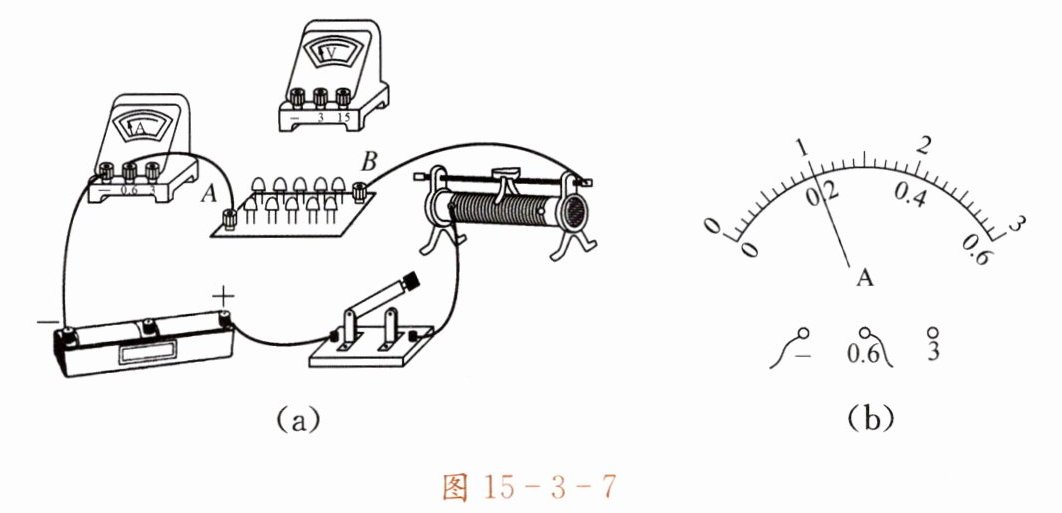 (4) 调节滑动变阻器使LED灯两端的电压为2.5 V,此时电流表的示数如图15-3-7(b)所示,可知电流大小是