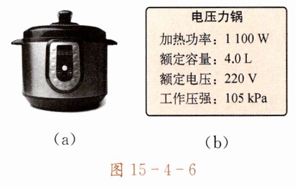 2. 图15-4-6为某品牌的电压力锅及其铭牌。在锅内装入质量为$2.5 \ \mathrm{kg}$、初温为$15 \ ^{\circ} \mathrm{C}$的食材,将其加热至$95 \ ^{\circ} \mathrm{C}$。[$c_{食材}=3.3 × 10^3 \ \mathrm{J} / ( \mathrm{kg} · \ ^{\circ} \mathrm{C} )$,$q_{天然气}=4.4 × 10^7 \ \mathrm{J} / \mathrm{m}^3$]