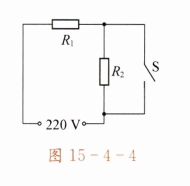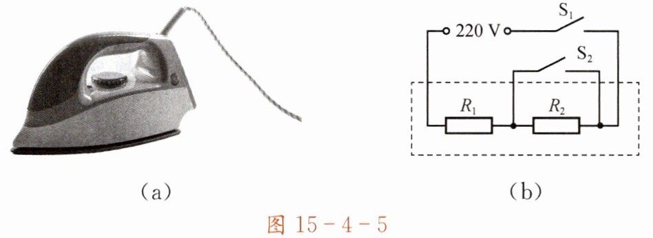 1. 图15-4-5是电熨斗及其简化电路图。该电熨斗有高温挡和低温挡两个挡位,其工作电压为$220 \ \mathrm{V}$。$R_1$和$R_2$均为电熨斗中的加热元件,$R_1$阻值为$48.4 \ \Omega$。只闭合$S_1$时为低温挡,此时电熨斗的电功率为$440 \ \mathrm{W}$。求: