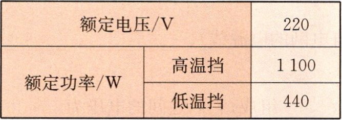 (1)解:$I=\frac{P}{U}=\frac{1100\mathrm{W}}{220\mathrm{V}}=5\mathrm{A}$