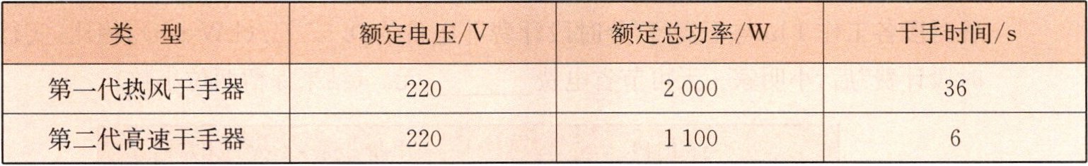 2. 某品牌第一代热风干手器热功率高,不仅耗能大,而且工作时电器内部温度高,电子器件和线路容易老化,使用寿命短;目前开发的第二代高速干手器采用高速电机,风速可达100m/s,只需要几秒钟即可干手,不需要高温,热功率低,所以耗能低,故障率也低,使用寿命长。两种干手器的参数对比如下表所示。