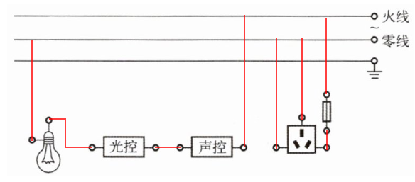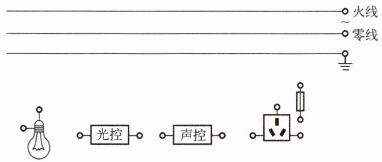 1. 小明设计了一种利用声控开关(有声音时自动闭合,无声音时自动断开)和光控开关(有光照时自动断开,无光照时自动闭合)自动控制的楼道灯,使得只有在天黑且有声音时灯才亮。他还在楼道处安装了一个带熔丝的三孔插座,且与楼道灯互不影响,请你根据小明的设计意图,用笔画线代替导线在图15 - 5 - 7中完成电路连接(导线不得交叉)。